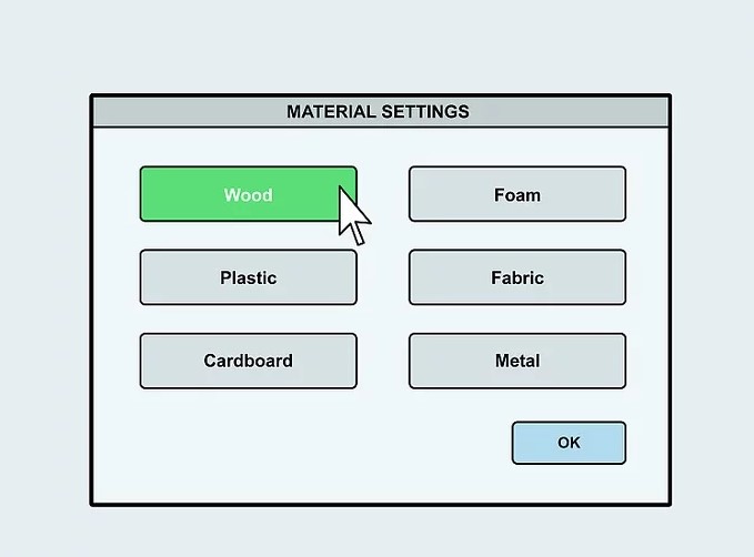 در مرحله بعد از آموزش کار با لیزر co2  در روی دستگاه در تنظیمات مواد نوع ماده استفاده شده خود را انتخاب نمایید و این تنظیمات را دستگاه ثبت نمایید. این کار بسیار حیاتی است زیرا به‌عنوان مثال اگر شما چوب را برش می دهید فشار قوی‌تری نسبت به برش فوم نیاز دارید، پس در نتیجه باید به دستگاه اطلاع دهید که از چه موادی استفاده می‌کنید و دستگاه چقدر فشار باید به ماده انتخابی شما وارد نماید. اگر می‌خواهید تصویر خود را برش دهید این دستور را به دستگاه دیکته نمایید و نوع برش خود را به آن دیکته نمایید، شما می توانید نوع برش خود را روی منوی دستگاه انتخاب نمایید روی منوی چاپ کلیک کنید.