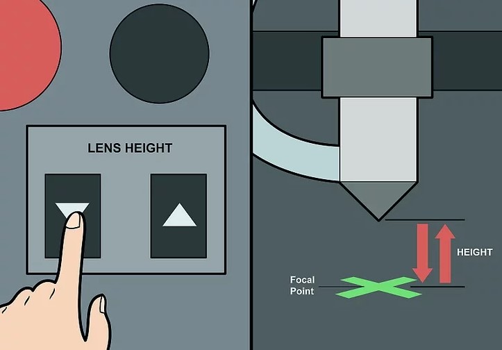 در مرحله بعد از آموزش کار با لیزر co2  ارتفاع لنز های دستگاه را با دقت تنظیم نمایید. بیشتر دستگاه های  برش لیزری CO2 دارای سنسور یا دکمه اتوماتیک تنظیم ارتفاع لنز هستند. هنگامی‌که مواد شما در وضعیت کاملاً صحیحی قرار گرفت، اگر دستگاه بطور خودکار تنظیم نشده ‌است، دکمه تنظیم ارتفاع لنز را روی دستگاه فشار دهید این کار باعث می‌شود که لنز لیزر بر سطح صحیح متمرکز شود. اگر دکمه تنظیم ارتفاع لنز در دستگاه شما وجود ندارد باید ارتفاع آن را به‌صورت دستی تنظیم کنید دفترچه راهنمای لیزر خود را بخوانید تا بدانید که چگونه باید اینکار را انجام دهید.